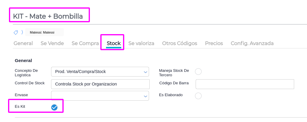 - Una vez completado todos los datos necesarios, para para que el producto sea KIT debemos seleccionar el check de “Es kit” dentro de la solapa de “Stock”