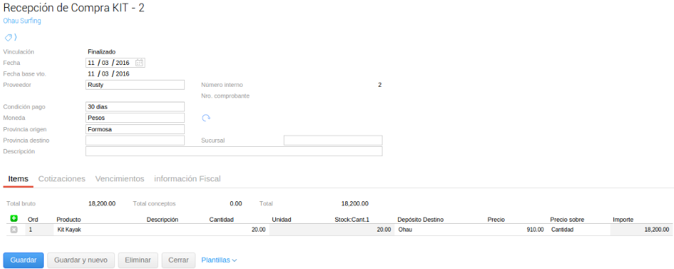 Si en la misma Recepción de compra se agrega un producto que no es Kit, al momento de registrar el ingreso, el sistema ingresa tanto los productos componentes del Kit, como el producto que no está configurado como Kit.