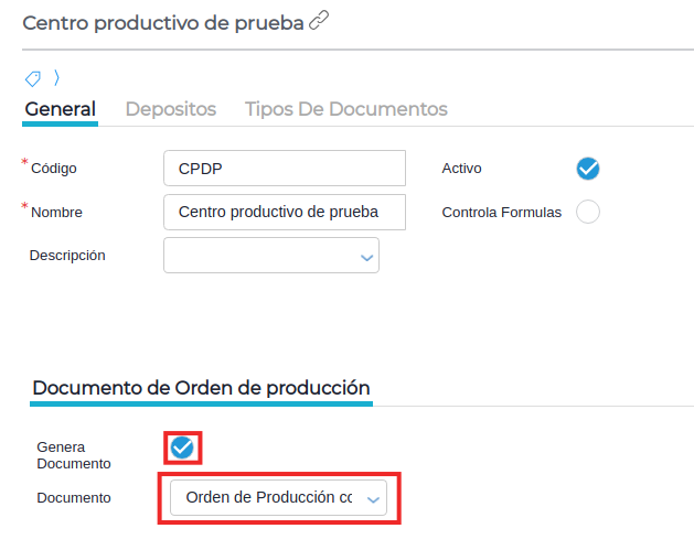 Activar la configuración para que genere Ordenes de producción, seleccionando también el documento que se desea generar: