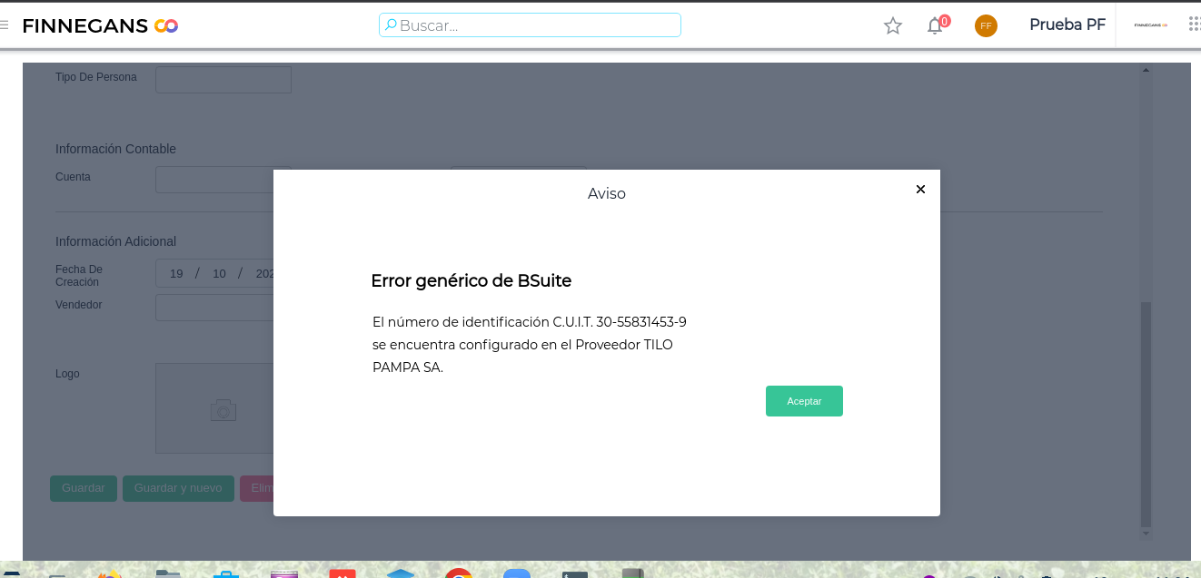 Consulta: Al cargar un proveedor aparece un cartel de Error genérico de Bsuite: “El número de identificación C.U.I.T. XXXX se encuentra configurado en el Proveedor Nombre”