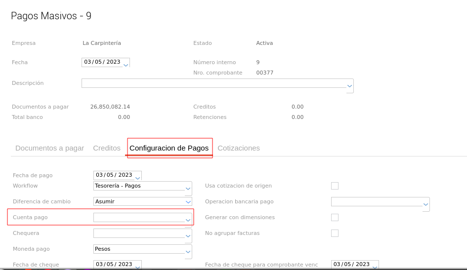 Cuando se utiliza la funcionalidad de Pagos Masivos, si la solapa Configuración de Pagos no tiene una Cuenta de Pago seleccionada,