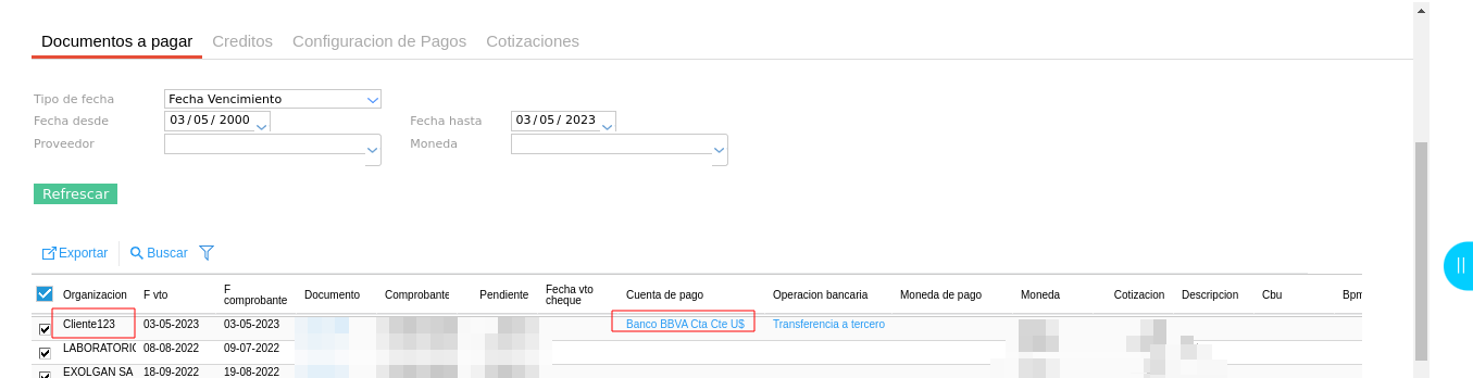 Si durante el proceso de Pagos Masivos se desea cambiar manualmente la cuenta de pago para algunos proveedores que no la tienen asignada, se puede hacer de la siguiente manera: