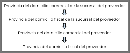 - Si se indicó una sucursal en el proveedor y esta tiene domicilio comercial, propone la provincia del domicilio comercial. De no existir domicilio comercial en la sucursal, propone la provincia del domicilio fiscal de la sucursal del proveedor.