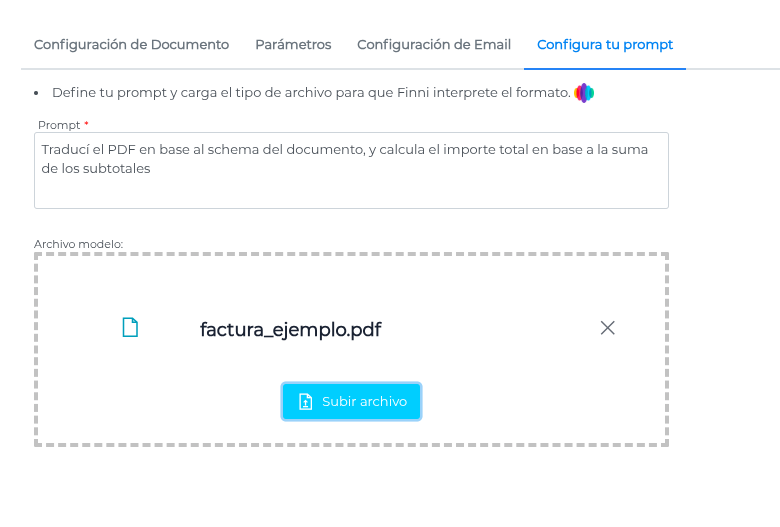 Dentro de la pestaña “Configura tu prompt”, debemos definir de que manera la inteligencia artificial debe interpretar nuestro PDF, y subir un archivo modelo de las publicaciones que recibiremos. En este caso, configuramos nuestro prompt indicando que se debe traducir el PDF en base al schema del documento, y calcular el importe total en base a la suma de los subtotales