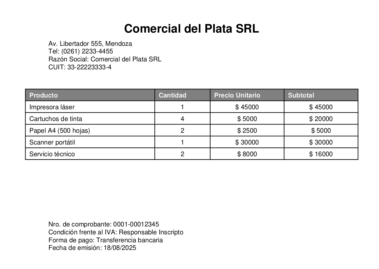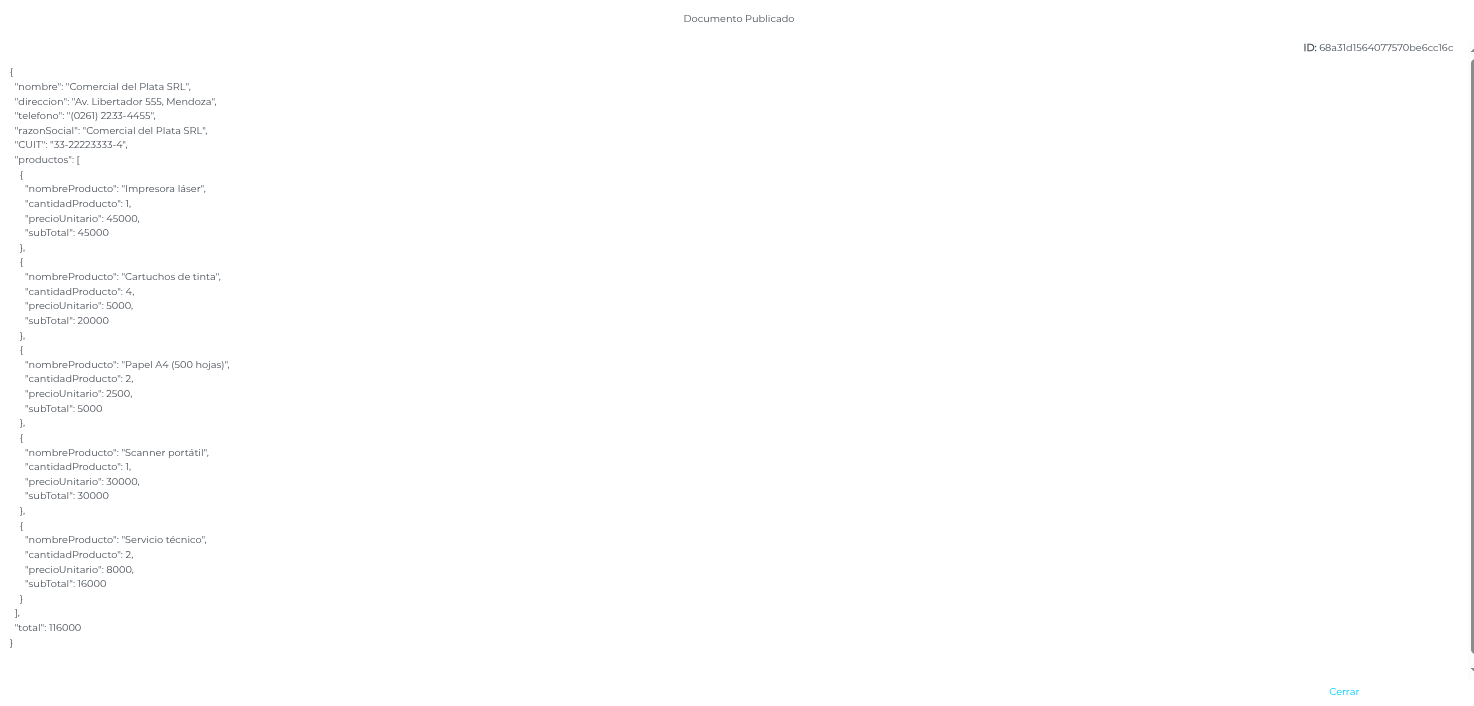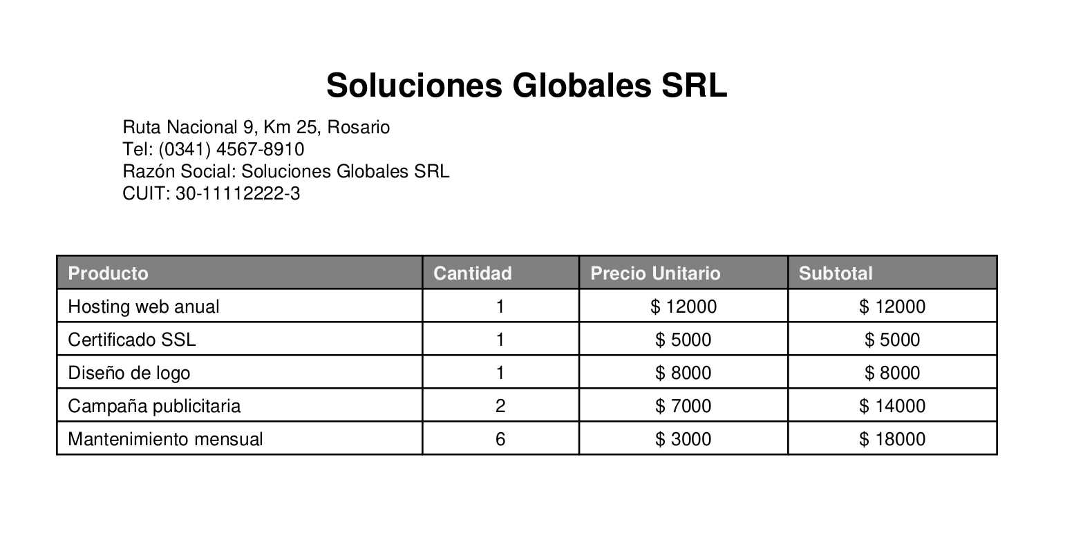 Por ejemplo, luego de enviar un mail con el siguiente PDF, podemos analizar como se publicó la información correctamente, calculando el total e ignorando los datos que no eran relevantes