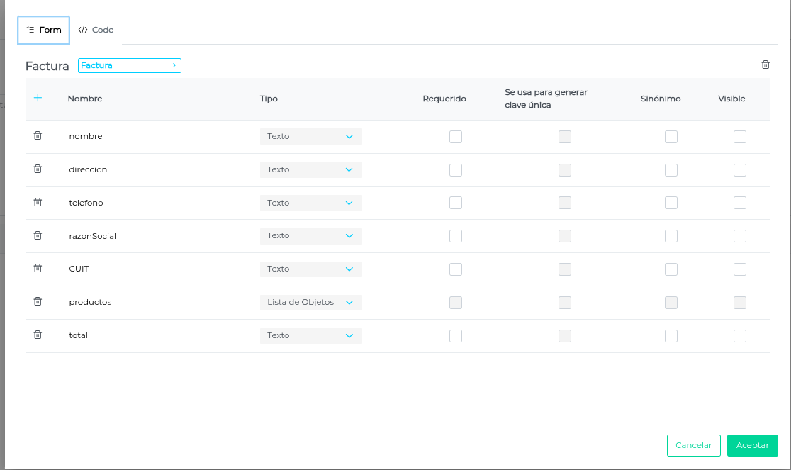 El primer paso es tener definido un documento. En este caso, lo realizaremos con una Factura de Venta, que cuenta con el siguiente schema: