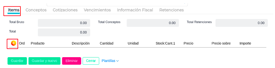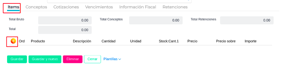 - Desde la pestaña Ítems acceder al botón + , para poder seleccionar el producto, cantidad, precio y dimensión - Aceptar