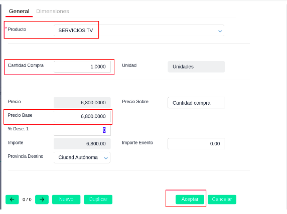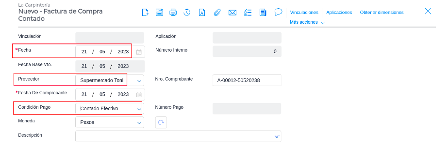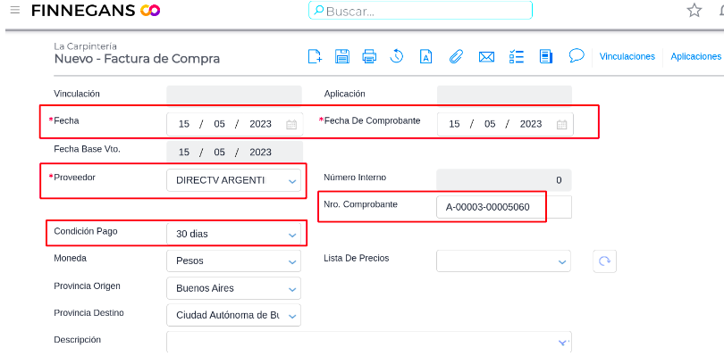 - Ingresar la Fecha del comprobante, Proveedor y condición de pago, Ejemplo