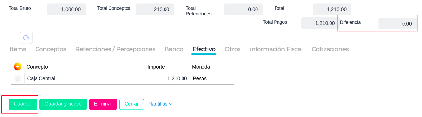 - El campo Diferencia nos informa si la carga está correcta. - Guardar