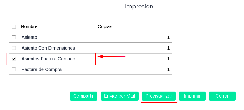 - Seleccionar la impresión: Asiento Factura Contado- Previsualizar