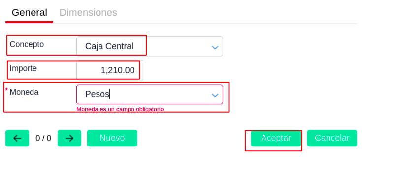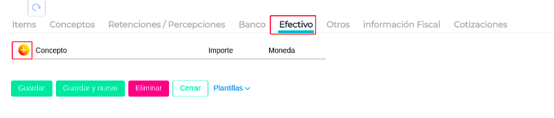 - Ahora indicar como se pagó la factura, en este caso efectivo. Ingresar a la pestaña Efectivo y a través del botón + seleccionar la cuenta Ejemplo Caja.