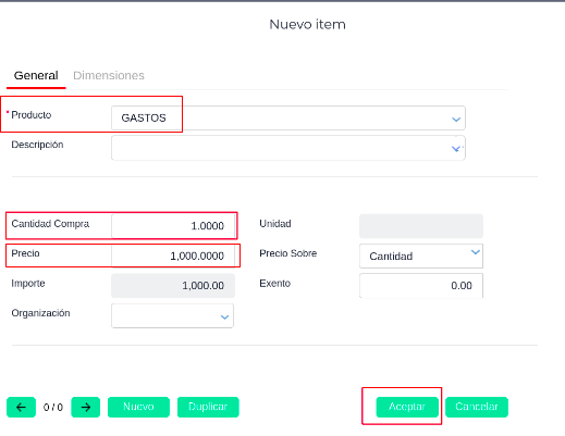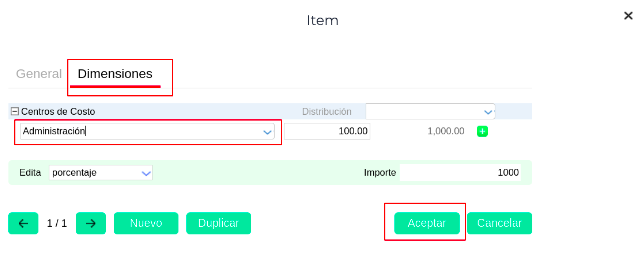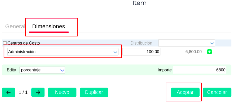 - Ingresar a la pestaña: Dimensiones y seleccionar el Centro de Costo