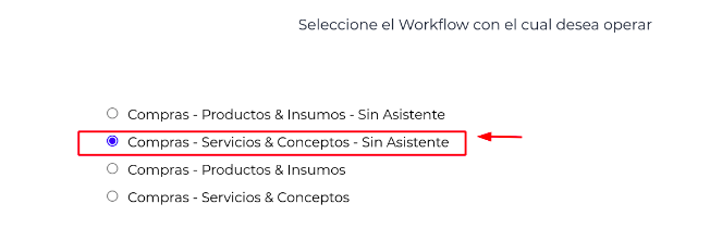 - Seleccionar el workflow, en este caso: Compras- Servicios y Conceptos - Sin asistente