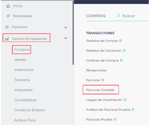 - Ingresar desde Menú - Gestión Empresarial - Compras - Factura Contado.
