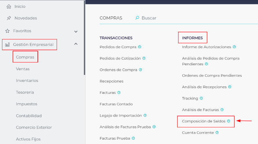 - Se procede a consultar el informe: Composición de Saldos, para esto ingresar desde el Menú - Gestión Empresarial - Compras - Informes - Composición de saldos.