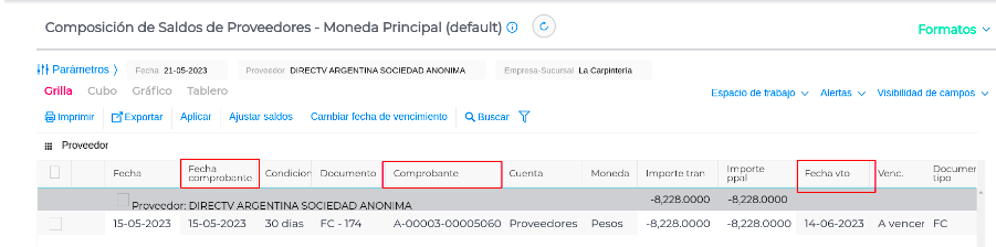 - Observar los datos de las columnas: Fecha Comprobante - Comprobante y Fecha de Vencimiento.