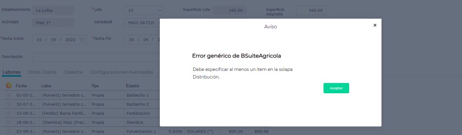 Consulta: Al reasignar actividad en plan agrícola, salta un error en el que: “Debe especificar al menos un ítem en la solapa de Distribución”