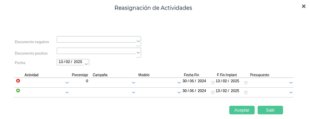 Es importante tener en cuenta que el modelo seleccionado debe tener la misma actividad a la cual se quiere reasignar, ya que por el contrario el sistema arrojará el siguiente mensaje impidiendo continuar con la operación: