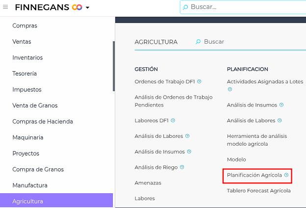 Se accede desde Menú Desplegable → Gestión Empresarial → Agricultura → Planificación Agrícola: