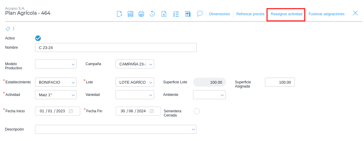 Es posible utilizar esta funcionalidad desde la grilla de Planificación Agrícola con el botón “Reasignación masiva” o directamente desde el plan que se quiere reasignar mediante el botón de “Reasignar actividad”. A modo de ejemplo se utilizará este último.