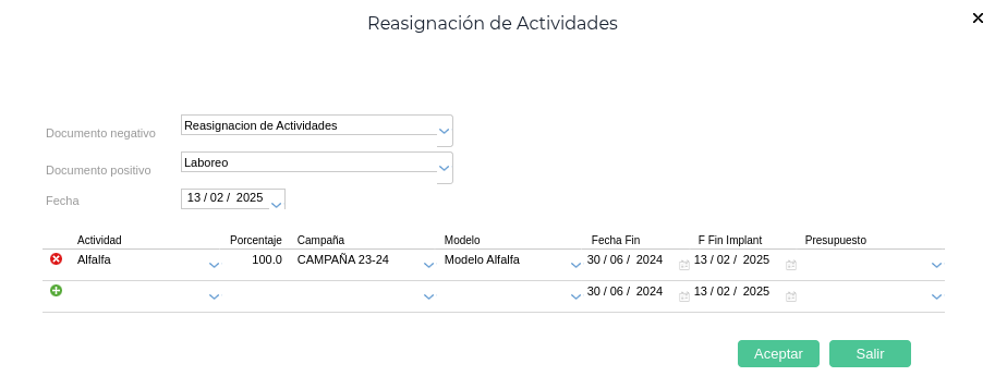 Un sencillo caso de uso podría ser el siguiente, en el cual el plan original (Maíz), se reasigna a Alfalfa. Se colocan los documentos positivo y negativo, la actividad, el porcentaje, la campaña y el modelo: