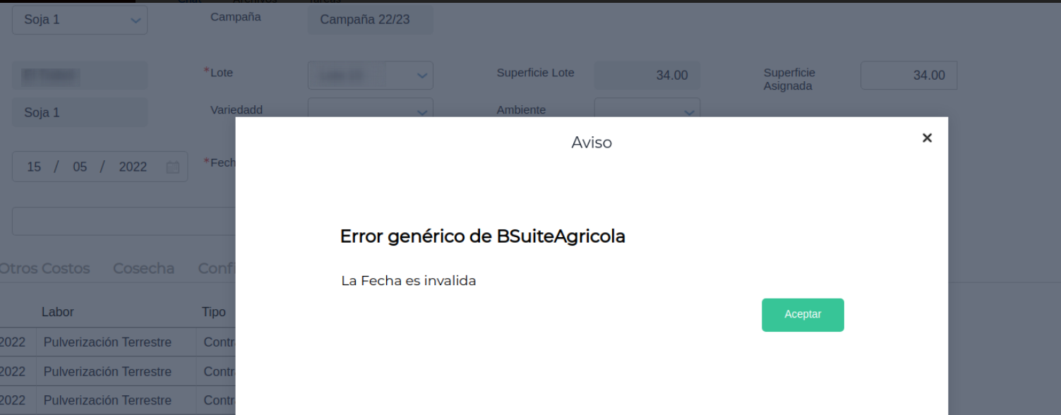 Al realizar una reasignación de actividades desde un plan agrícola, el sistema arroja un error.