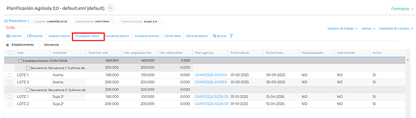 Para saber como configurar correctamente la Planificación Agrícola dirigirse a la siguiente entrada: Planificación Agrícola 2.0 - Alcance - Agro - Base de Conocimiento Finnegans