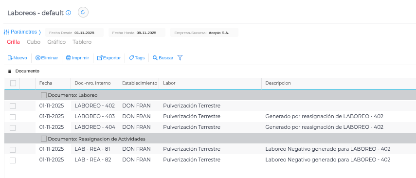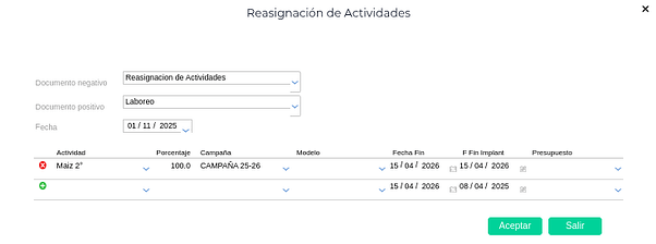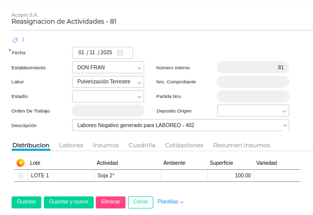 Luego la reasignación genera un documento negativo llamado Reasignación de Actividades. Cabe destacar que este laboreo está configurado como negativo, por lo tanto cancela al laboreo anterior.