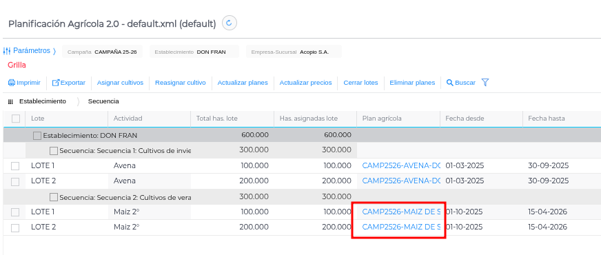 En la misma se puede ver que el plan nuevo asignado “Maíz de segunda”