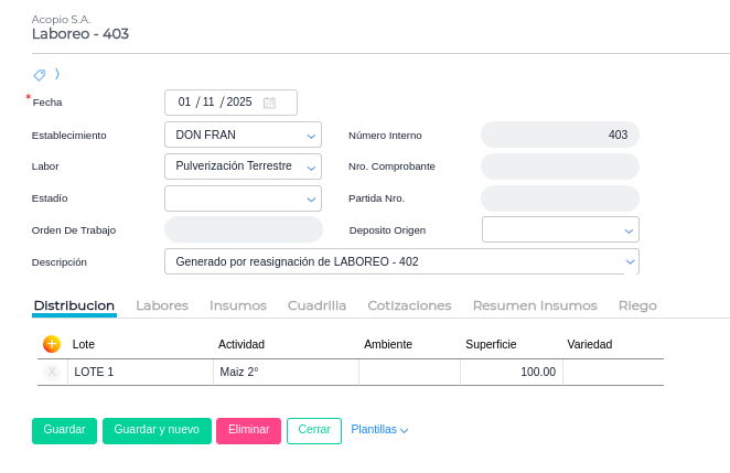 A continuación se autogenera el laboreo que dará de alta el nuevo laboreo para las nuevas actividades en el mismo lote.