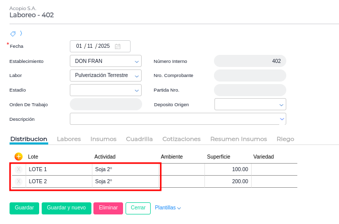 Al ingresar al Laboreo - 402 se verá que es referido al lote 1 y lote 2 y a la actividad anterior, Soja de Segunda.
