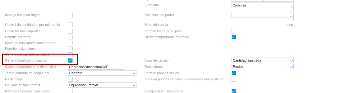 Respuesta: Lo que debemos tener en cuenta es, en el tipo de documento que estemos generando, en este caso la liquidación de compra de granos, debemos tildar el check de “Genera bonificación/castigo”