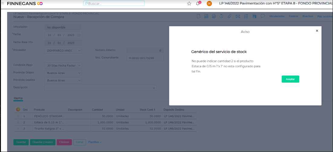 Cuando quiero guardar una Recepción de compra y guardarla, el sistema muestra el siguiente mensaje: “Genérico del servicio de stock”: