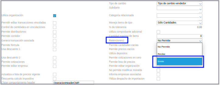 Seleccionar en el campo retenciones la opción “Emite”, esto habilitará la solapa retenciones en la configuración de tipo de documento.