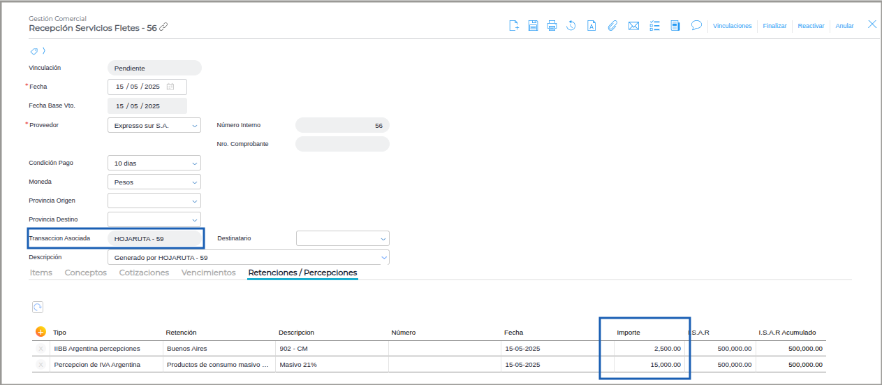 Nota: También se van a calcular las retenciones de forma automática si la recepción de fletes se crea por transacción asociada o desde la solapa transporte, definiciones que se hacen en la configuración de tipo de documento, ver más en el siguiente instructivo Cómo genero una transacción asociada a partir de otro documento.