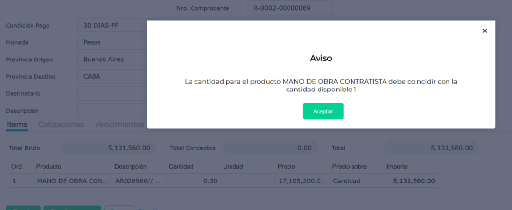 Al intentar guardar una transacción de Recepción de servicio (recepción de compra sin impacto en stock) el sistema emite el siguiente mensaje:
