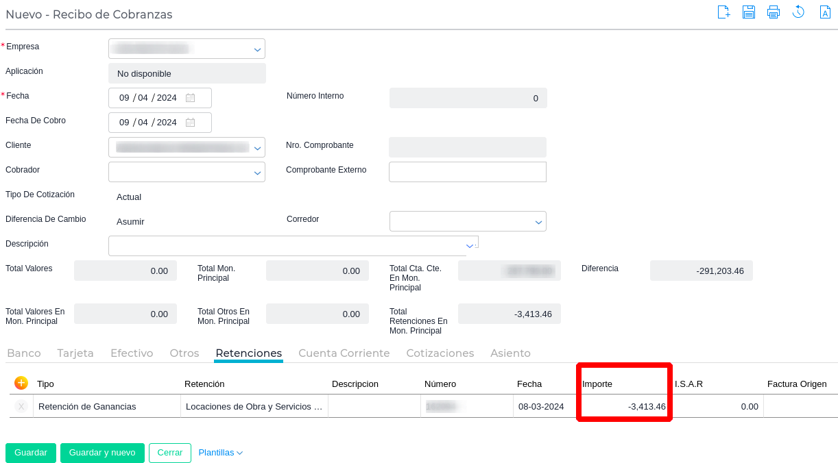 Al ingresar manualmente la retención, dentro de la cobranza, y hacerle click en aceptar, el importe de la retención se cambia a negativo automáticamente.