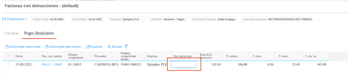 - Completar el campo “Nro detracción”, con el número brindado por la SUNAT.