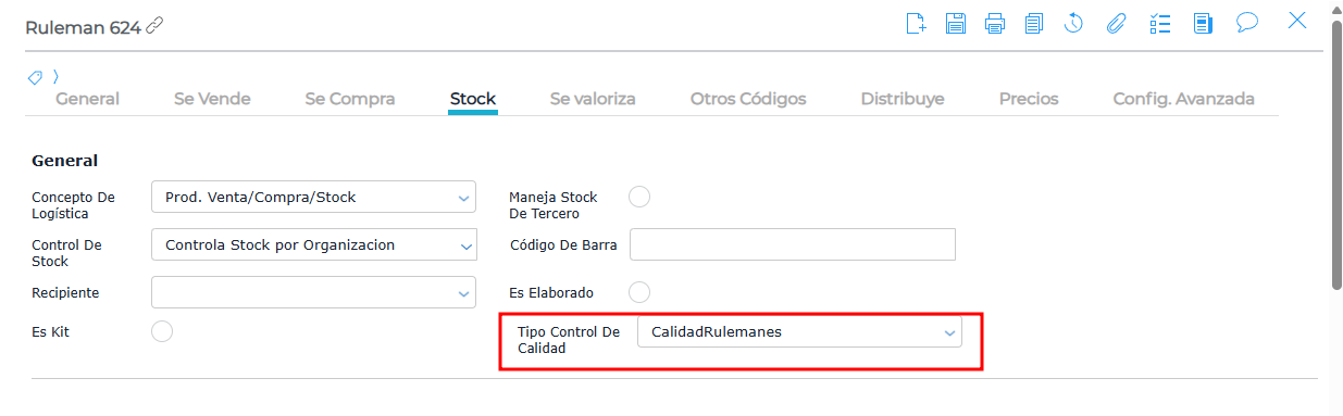 - Asignar al producto el Tipo de Control creado anteriormente.