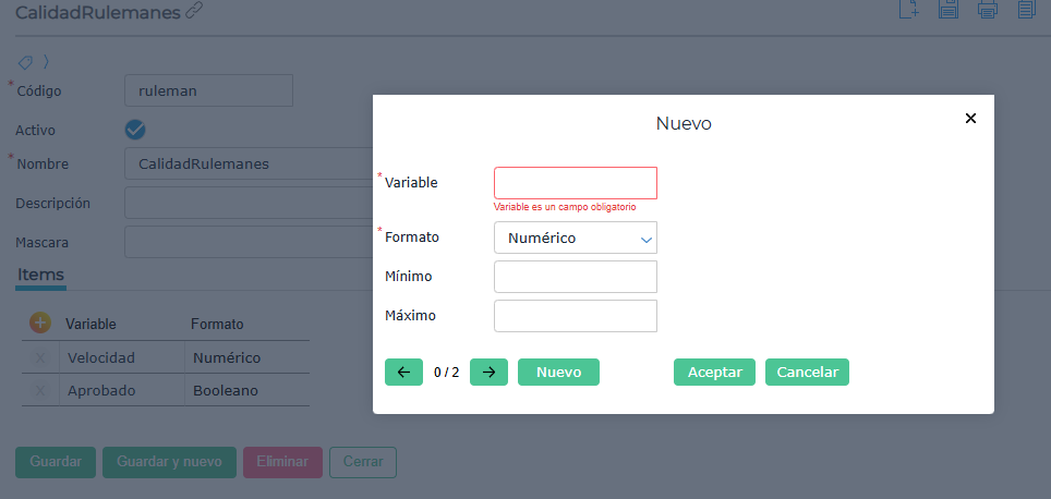 - Desde el maestro de Tipos de Control de Calidad, se debe crear un nuevo tipo, el cual agrupará una o más variables que serán evaluadas al momento de realizar el control sobre los productos.
