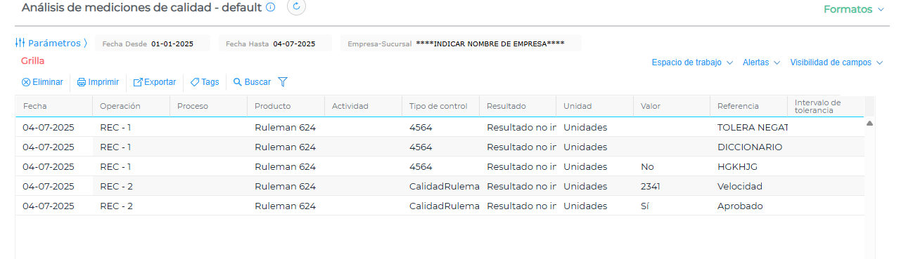 Esta funcionalidad permite registrar controles de calidad sobre productos en documentos operativos (como despachos o recepciones), configurando variables específicas por tipo de control. El sistema centraliza los resultados en documentos Texto preformateadoasociados que permiten su edición y análisis posterior, con trazabilidad completa.