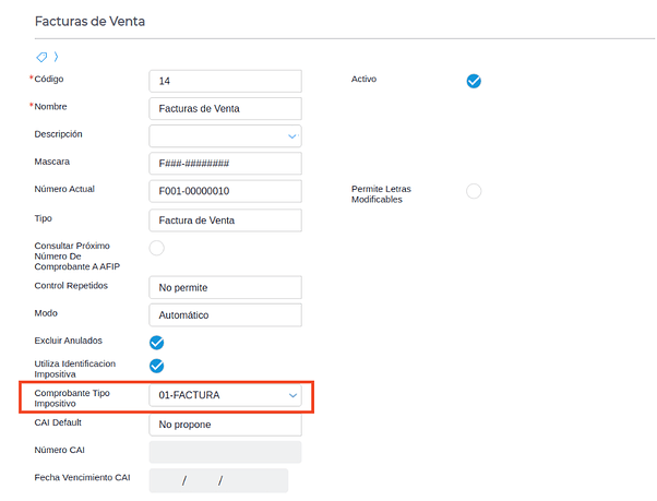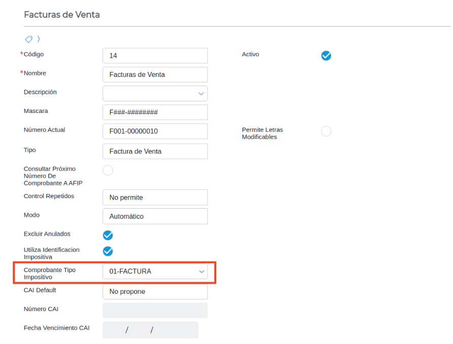 - Verificar que el talonario tenga un tipo de comprobante impositivo asignado.