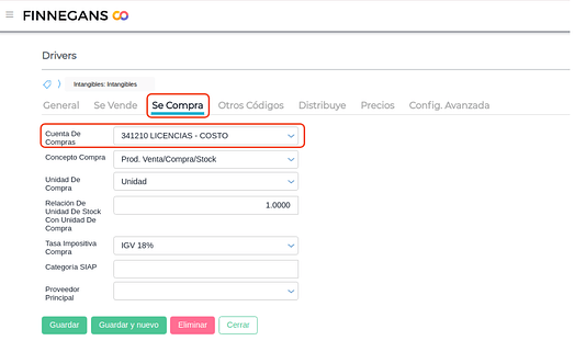 En el Maestro de Productos, cargar el bien intangible. En la solapa “se compra”,en el campo “Cuenta De Compras”, indicar la cuenta de activos intangibles que pertenecen a la rama 34 del árbol de cuentas.