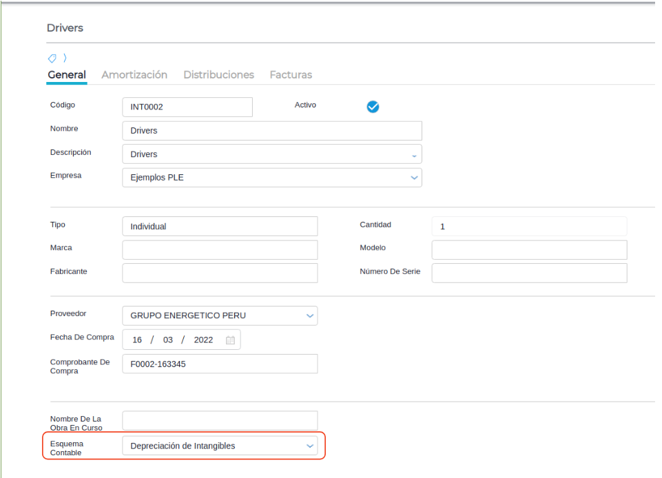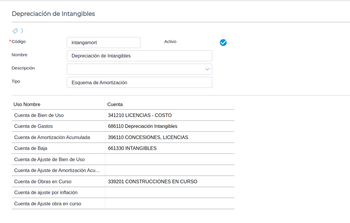 En el Maestro de Bienes de uso, cargar el bien intangible. Dentro de la solapa general en el campo “esquema contable”, se debe seleccionar el esquema contable “Depreciación de Intangibles”.
