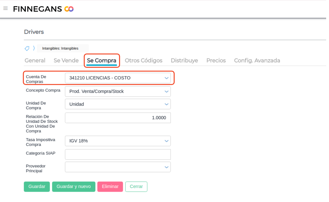 - Cuenta: Debe seleccionarse la rama 34-INTANGIBLES