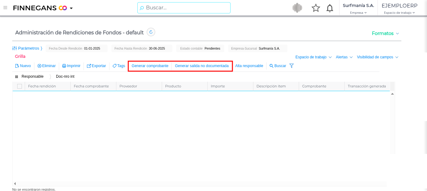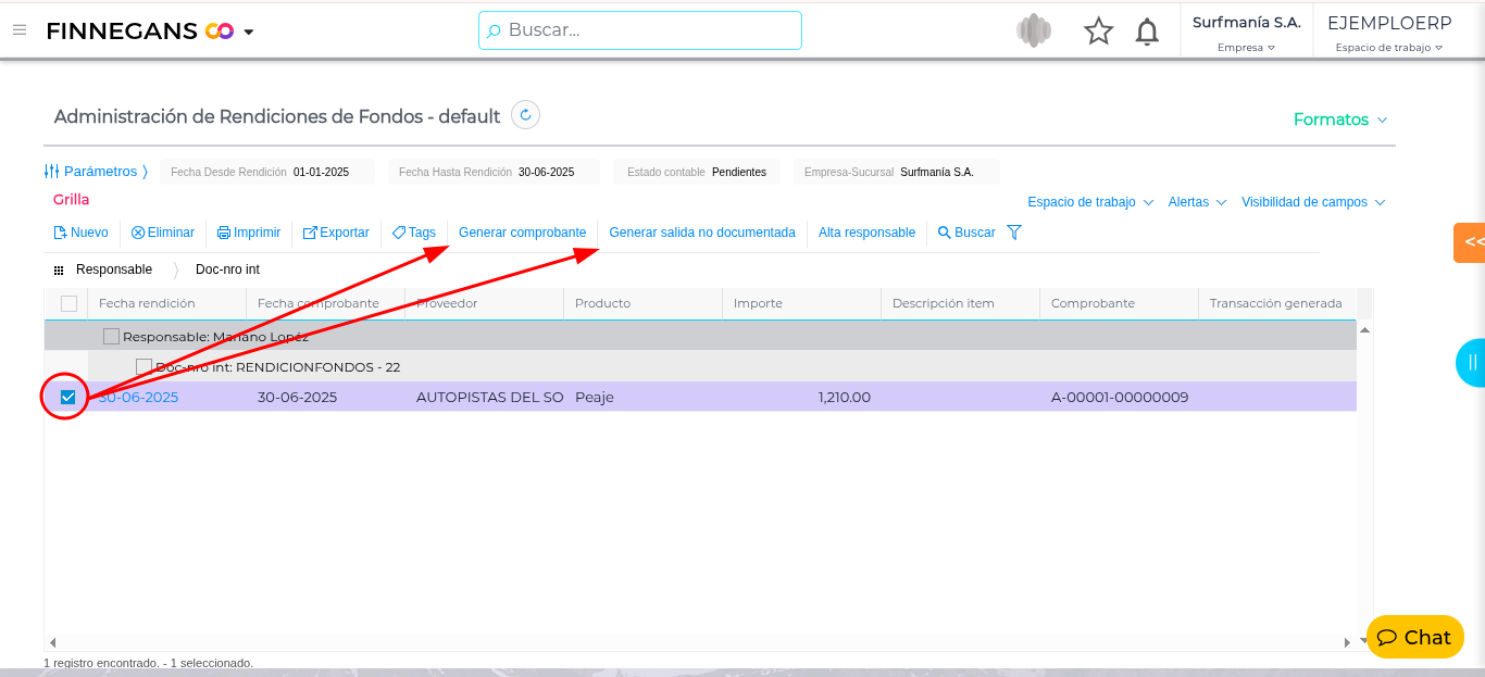 - Una vez autorizada la rendicion de fondos queda disponible para generar comprobante o salida no documentada.