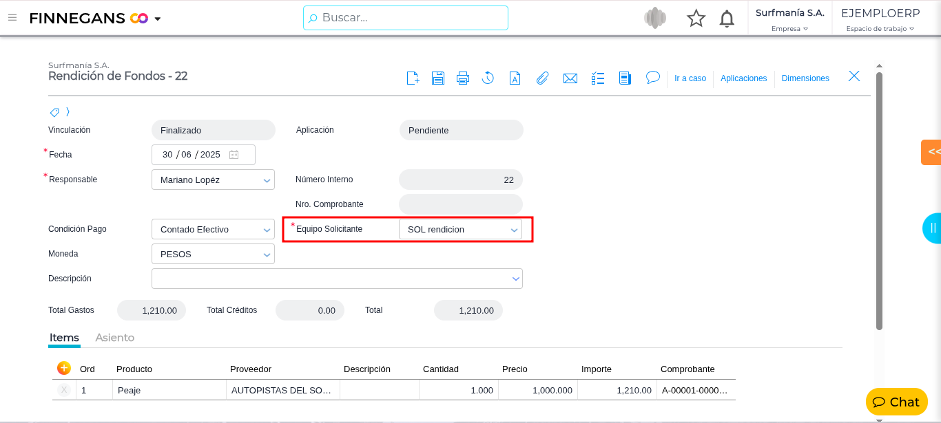 Al cargar el documento de tipo rendición de fondos se visualizara el campo “equipo solicitante”.