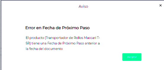 Para solucionarlo, hay que modificar la fecha de próximo paso indicando la misma del remito, o bien, modificar la fecha del remito y ponerle la misma que tiene el producto.
