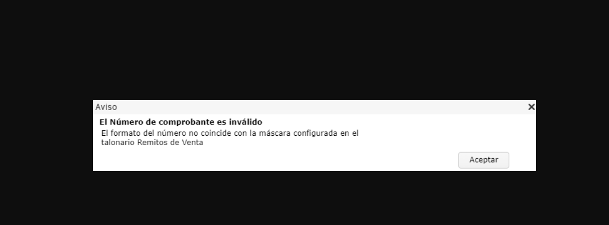 Al querer guardar un remito de venta, el sistema muestra el siguiente mensaje: “El formato del número no coincide con la máscara configurada en el talonario Remitos de Venta”.