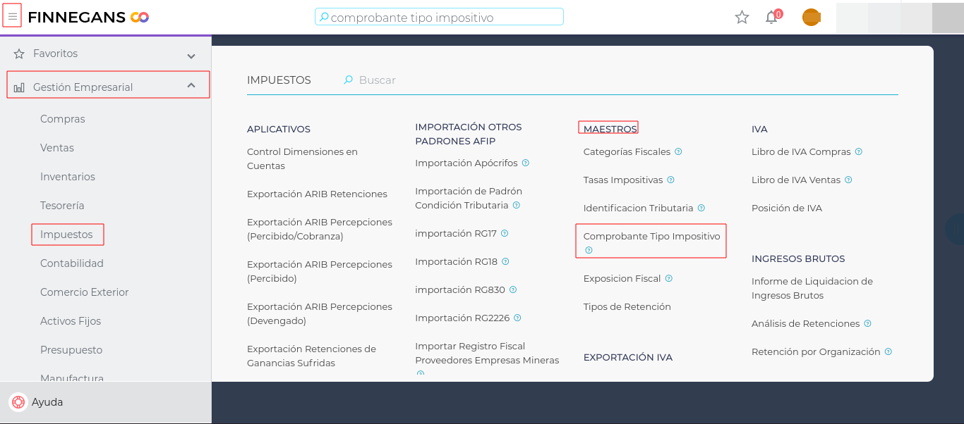 - Para poder activar el check se debe hacer desde el maestro de “Comprobantes Tipo Impositivos”, acceder desde, Menú ⇾Gestión Empresarial⇾ Impuestos⇾Maestros⇾ Comprobantes tipo impositivos.